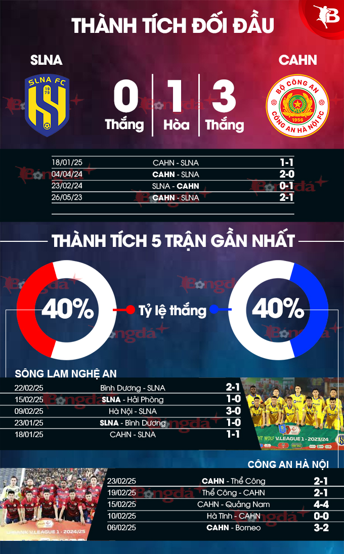 Đá sân nhà, nhưng lực lượng của SLNA không được đánh giá cao bằng đội khách CAHN. Trong 4 lần gặp nhau, tính từ mùa giải 2023 khi CAHN có mặt tại V.League, họ đã thắng SLNA đến 3 trận và chỉ có 1 trận hoà. Đặc biệt, trận hoà ấy diễn ra hồi tháng trước ở lượt đi của V.League 2024/25. Trận hoà ấy cũng chính là điểm tựa để thầy trò HLV Phan Như Thuật thêm niềm tin họ có thể giành được điểm từ đối thủ ở trận đấu trên sân nhà.